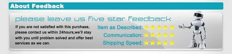 * We will provide positive feedback once payment is received. To foster a healthy Ali community, we hope you will do the same for us. We want you to understand that we value customer service tremendously. If you have any dissatisfaction, please give us the opportunity to resolve the problem before leave us a negative feedback. We are sure that there is always solution and we sure don`t want a bad feedback to be where the transaction ends.